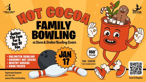 Escape the winter chill and gather the fam for an afternoon of strikes, spares and cups of hot cocoa. Join us for a heartwarming event, Hot Cocoa Family Bowling, on Jan. 17 at the Stars and Strikes Bowling Center. Enjoy 2 hours of Unlimited Bowling (with shoe rental), Gourmet Hot Cocoa, and wintery snacks! Plus chances to win door prizes.
