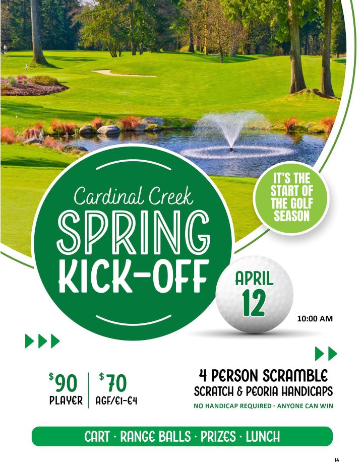 Come kick-off the golf season at Cardinal Creek by playing in their Spring Kick-Off Scramble on Saturday, April 11. Tournament format is a 4 person Scramble with Scratch & Peoria Handicaps (anyone can play and win!).  Space is limited so register early!