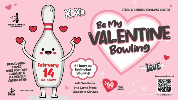 Celebrate love with strikes and spares at the Stars and Strikes Bowling Centers Valentine Crazy Bowl, on Feb. 14. Bring your loved ones for a day of fun, laughter, and friendly competition. Enjoy 2 hours of unlimited bowling (with shoe rental) and unlimited non-alcoholic drinks.